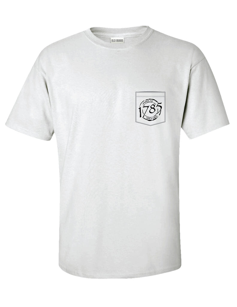 6.1 oz. 100% Ringspun Cotton. Small Logo on Pocket & Large design on Back.